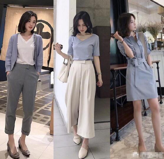 温柔的配色,不仅彰显气质,更能加深同事们对你的好感,灰色的烟管裤搭配V领的T恤,外搭蓝紫色的小开衫,搭配一双咖色的方头鞋,职业又不失女性的柔美,米色的阔腿裤搭配蓝色的半袖上衣,温柔大方。