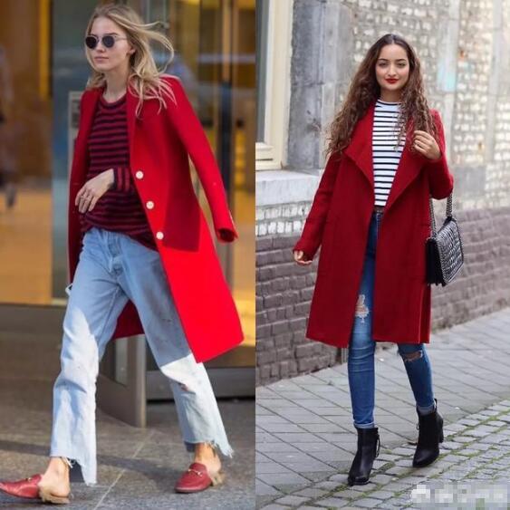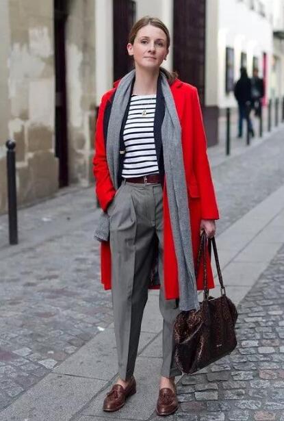 当然,红色羊绒大衣搭配条纹衫也是可以穿出干练优雅的气质感,比如叠穿黑色西装和灰色西装裤,很适合上班的女生。