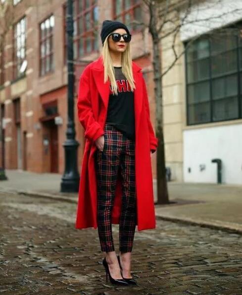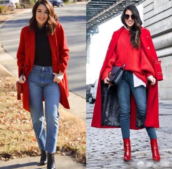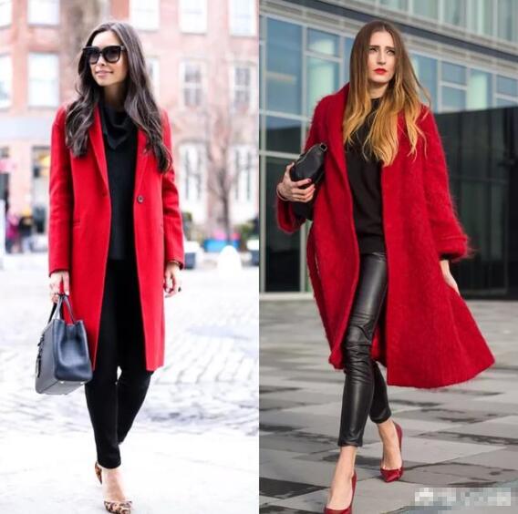 红色搭配黑色,简单不出错的组合,大面积的红色容易显的聒噪,而黑色的内搭调和红色的跳跃感,增添一丝沉稳气质,比如红色羊绒大衣+黑色毛衣+黑色皮裤或者黑色小脚裤。