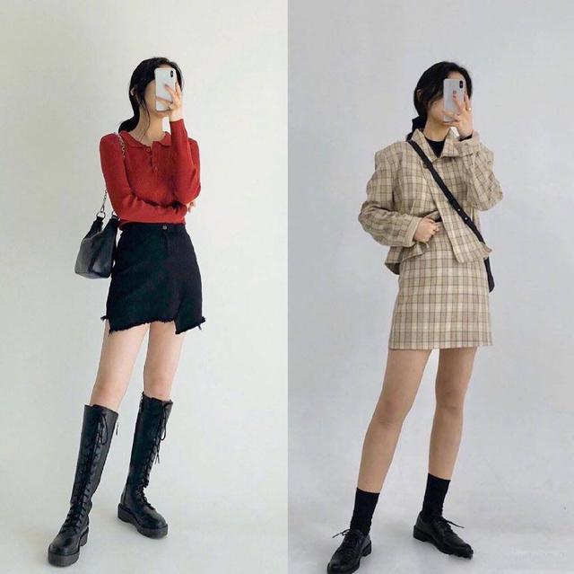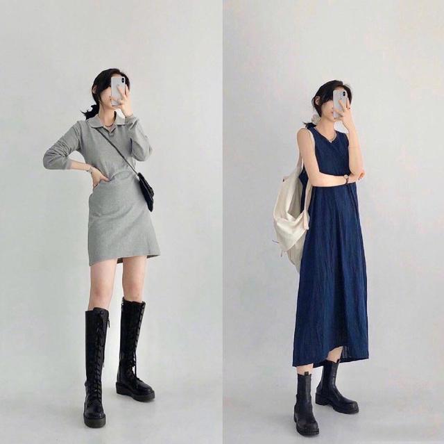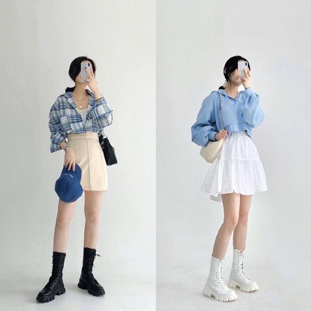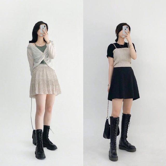 搭配一双黑色的高筒马丁鞋,淡雅不失帅气,深深的V领显得女人的脖子很修长,所以可以搭配一条锁骨链。~