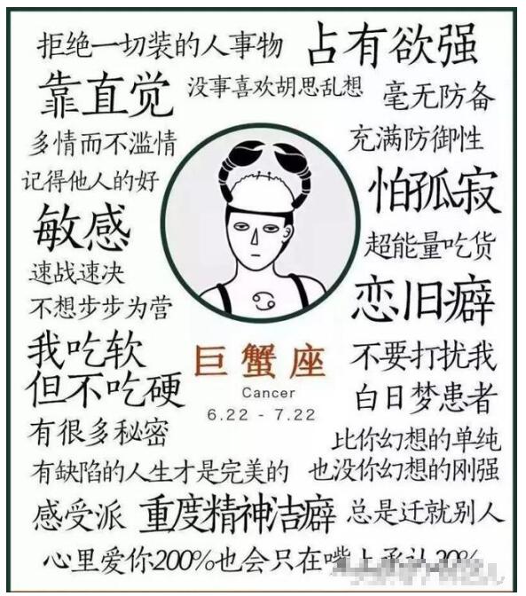 巨蟹座细腻顾家,但内心戏太丰富,容易为别人的一句话纠结郁闷很久,这次水逆会对巨蟹的工作环境和工作任务产生影响,比如临时遇到繁琐的小事需要处理啊,或是文档丢失,被上级批评等等,总之在水逆期间,巨蟹座的思路是混乱的,建议妹纸们学会自我消化,不要让情绪主宰自己的生活,给自己一点信心,肯定会有解决办法的,对不?