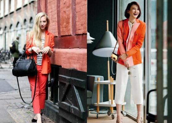 外套面积足够大, 最先进入视野,所以来款小西装是最合适不过了,配合其他造型单品特别是可以与外套相呼应的元素,既可以令单品之间呼应,也弱化了大面积橙色的存在感。