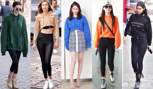 卫衣穿搭中最流行的是搭配短裙、短裤和紧身长裤等凸显腿部的穿搭方式,非常适合腿型和腿部曲线好看的人,如果上下身比例不甚完美,适合选择高腰款式的下衣搭配短款卫衣或将卫衣塞进下衣中,用来拉长下半身比例,再不满意下半身效果,穿厚底鞋或高跟鞋都是很好的显高方式。