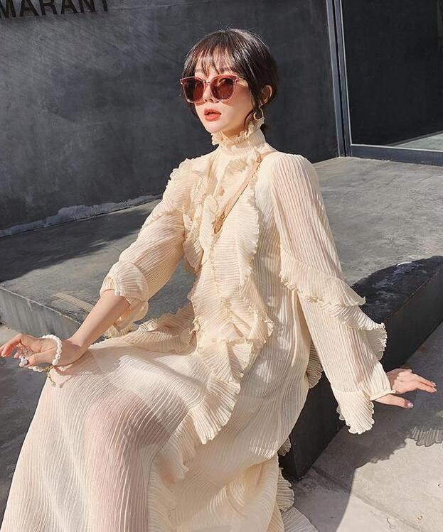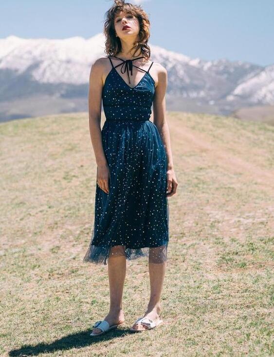 细吊带的裙装看起来确实飘飘然的给人一种轻盈的感觉,但是因为带子的设计会使一些肩宽肥壮的女生感受缺陷被放大的效果。尤其无袖的设计一定要考量自身胳膊的肥瘦来购买,避开展露缺陷的设计。