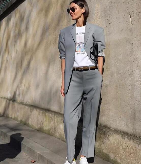 这种穿发适合腿真的比较长的姑娘,或者就是腿形很美的人。总之灰色西服和运动风格的打底衣或者裤子搭配就对了。年轻气息十足。