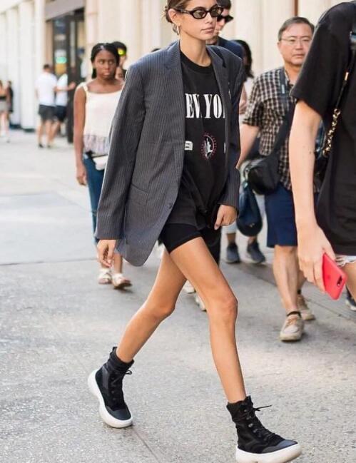 勇敢露出大长腿,搭配酷酷的马丁靴或者运动鞋就好。这种穿法会比较潇洒,非常美式反而。内搭T恤就显得随意街头一点。当然内搭衬衫也很不错。