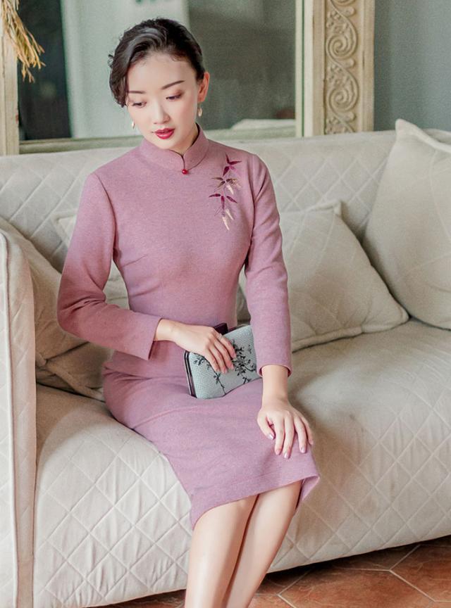 粉色的针织旗袍,带着极度简约的高级韵味,俏丽脱俗,不张扬的妩媚与柔美,就这样静静的释放出来,立领点缀一颗莹润的珠扣,雅致高贵,肩上一朵精美的刺绣,带着中式的典雅风情,搭配一双高跟鞋,气质落落大方,时髦又知性的女人味。
