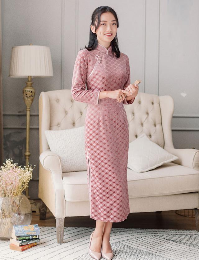 烟粉色的温润恬静,不似一般粉色那么的俗气,与妩媚又深情的丝绒相互融合,散发着浓浓的女人味,交织的菱形格纹折射出唯美的光泽,时尚又典雅,旗袍完美的勾勒出曼妙的身材曲线,行止间摇曳,将整个秋天都点染得文艺又浪漫。