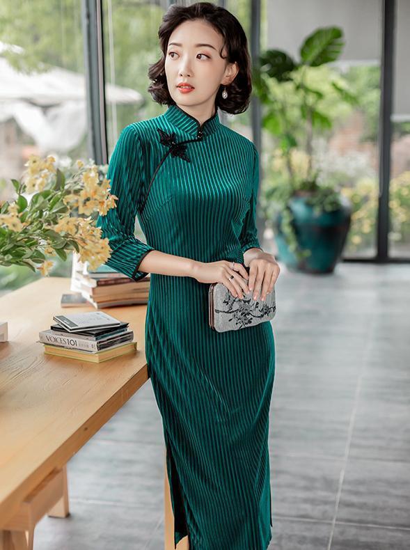 绿色的清新与活力,尤其在秋风落叶的季节最为出挑,丝绒表面氤氲着华美的光泽,柔美的线条与竖条纹,将女人的身材修饰得玲珑婀娜,旗袍领衔接着斜襟,精美的盘扣点缀,落落大方,无需胭脂红透的缀饰,转身之间也能轻易的悸动人心。