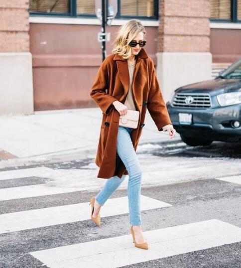 如果说藏蓝色是优雅气质的代表,那么天蓝色则是青春的代名词,另外,天蓝色也有显白的作用,咖啡色大衣+驼色毛衣+天蓝色牛仔裤,小小的蓝色赋予清新与年轻感。