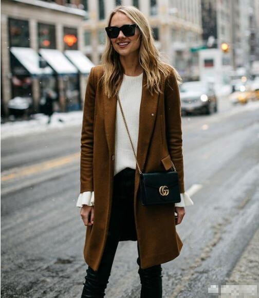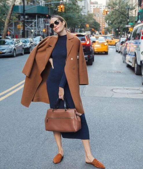 个人觉得藏蓝色是一个超级好搭又不会觉得乏味的高级色,咖啡色大衣配什么内搭?比如咖啡色大衣搭配藏蓝色的修身连衣裙,小小的开叉露出腿部线条感,配上优雅大方,尽显气质。