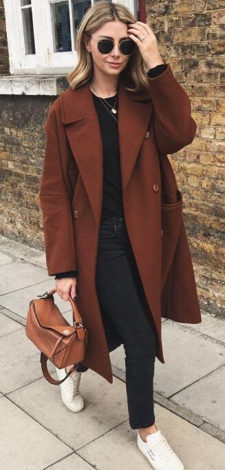 冬季的内搭决定少不了黑色,黑色+咖啡色,优雅大气,任何场合都可以驾驭,尤其内搭是all black,比如咖啡色大衣+黑色毛衣+黑色长裤,配上一双小白鞋,简约不失时尚感,用硬币项链作为点缀,增添复古气息。
