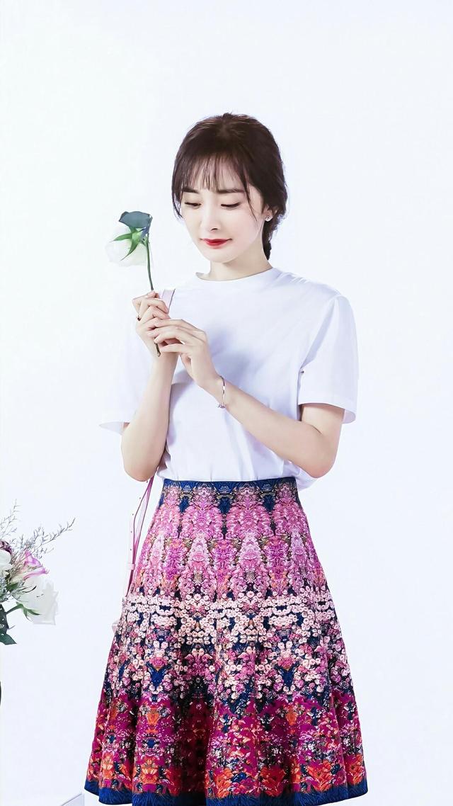 纯白色体恤搭配混色花短裙,这样的裙子很多人都看不明白,因为十分没有美感,而且还显老,不知道的人会以为这是家里老一辈的人所穿的裙子呢,其实,这样的裙子走的风格还是时尚复古分,为的就是纪念老一辈的人带给大家的时尚感,扎着低马尾辫子,微卷的空气刘海时尚潮流。