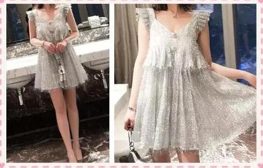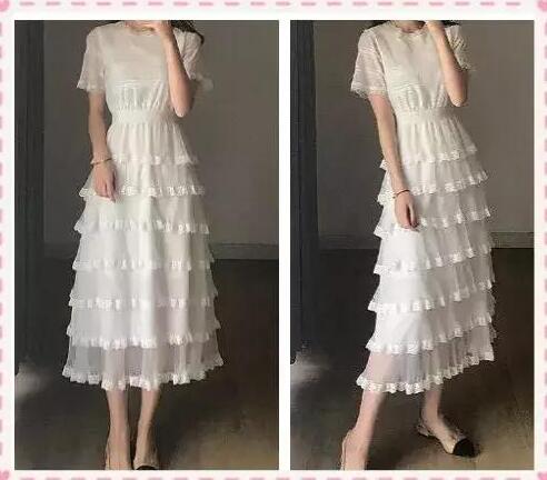 夏季超级仙的蕾丝蛋糕连衣裙,宽松袖型,蕾丝花边设计,长短适中,有效纤细手臂,高腰修身,显瘦效果好,拉长身高比例,增强视觉感,优雅蛋糕裙摆,露出相对纤细脚裸,优美而不落俗套。