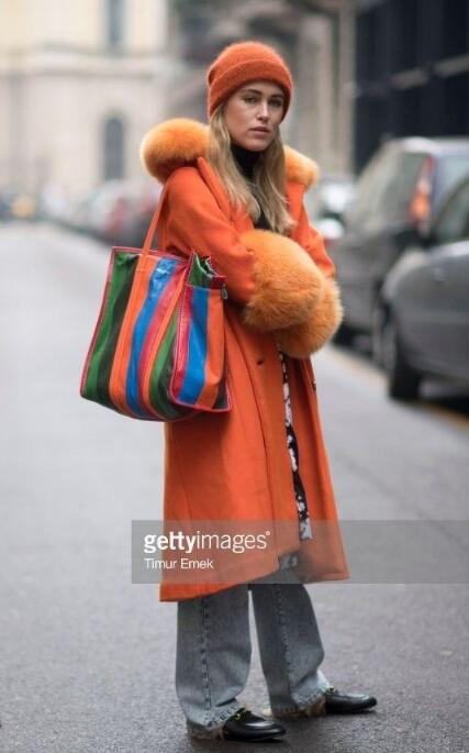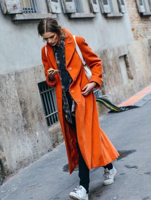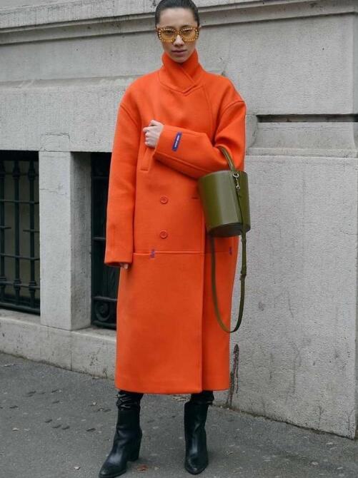 上面的那套穿搭虽然简单,但我觉得还是很挑人的,个子高的女生会更适合,否则很容易穿出路人穿搭。而下面的这套搭配,适合各种身材的女生,潮范十足。橘红色大衣搭配黑色高跟鞋,增加穿搭的气场,绿色的包包更是形成撞色搭配,时髦感满分。