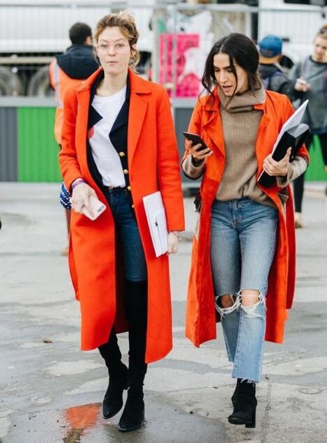 橘红色大衣搭配图片橘红色是一种比红辣椒色黄而淡、比火红色稍红的浓红橙色,颜色鲜艳醒目,含有红色、黄色的属性,所以也会给人温暖而热烈的感觉,是很适合秋冬季节的颜色。