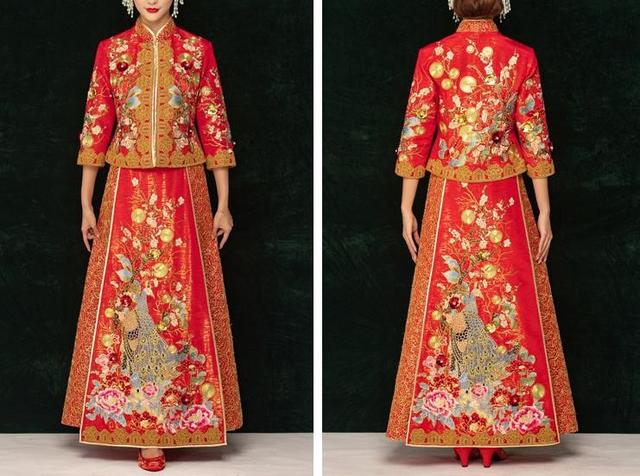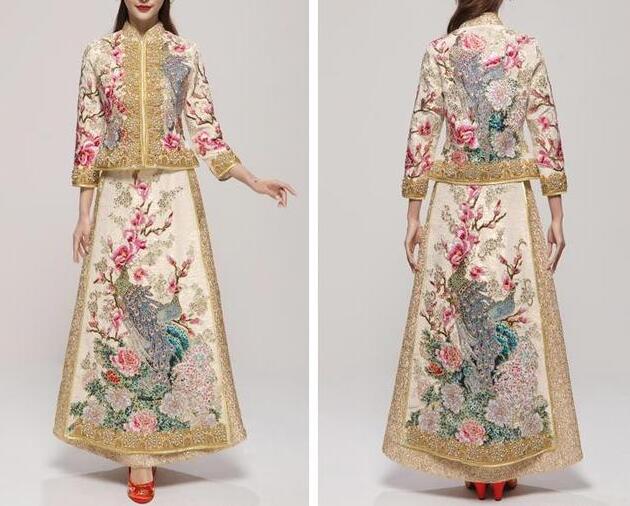 作为一名中国人,真心觉得中式礼服太精致啦,这套敬酒礼服传承着中华之美,其特点展现在:七分袖口设计显得方便灵活,立领的设计凸显气质,精工的孔雀刺绣尽显精致感,加上金属色的刺绣手艺,绘制出一种属于中华民族的美感,既时尚又显得浪漫,让你在婚礼上展现主人翁的新娘魅力!