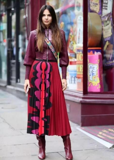 红色长靴非常经典,特别有女人味。搭配一件红色百褶裙,甜美优雅又显高。上衣get一件 红色短款皮衣,十分帅气,皮衣的短款设计在,给人腰以下全是腿的=既视感。把头发放下来,增加了甜美度。