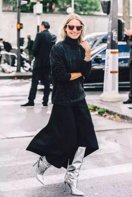 银色的长靴,特别吸睛。搭配一条黑色的裙子,甜美优雅又显高。上装get一件黑色毛衣,时髦又保暖,和黑色裙子同色,特别显瘦,展现高挑的身材。pick一副墨镜也加分不少。