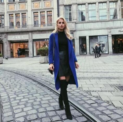 冬季怎么穿才美?pick灰色长靴搭配一条黑色的毛衣裙,中性风的搭配,经典过时。在裙子上系一条金色的腰带,充分展现了大长腿,一抹金色起了点睛作用,增加了亮点。外套pick一件蓝色大衣,时髦又保暖。