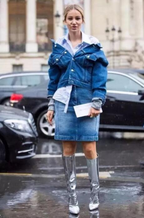 银色的长靴,十分吸睛,打破了沉闷的冬天的单调感。搭配一条牛仔裙,在帅气中融入了个性。上衣搭配一件牛仔外套,套装搭配特别显气质,内搭一件衬衫显得特别有精气神,甜美优雅又显高。