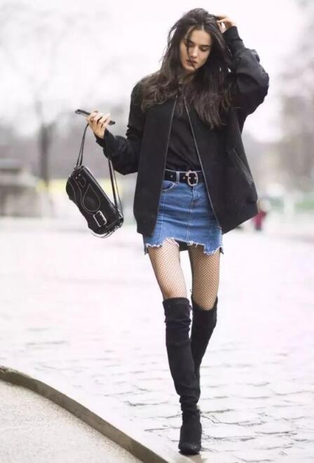冬季怎么穿才美?pick黑色长靴搭配一条浅蓝色的牛仔短裙,展现了修长的腿。网状丝袜更是增加了一些女人味。上装pick一件黑色的短外套,非常帅气。内搭一件黑色单品,不仅显瘦,还十分简约,和长靴的黑色相呼应,十分有整体感,手上pick一个黑色的手提包,十分优雅。