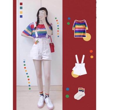 这一身搭配特别的少女,青春洋溢,很活泼很有元气的样子,不管是在色彩上面还是在整体的款式上面都超级的减龄哦。彩虹元素有一点今年大火的“泫雅风”的味道,也可以说是跟随潮流了,搭配上一条白色的高腰背带短路,又俏皮又显腿长,裤子是有点阔腿的裤型,所以也有点显瘦的作用哦。随意穿上一双小白鞋,在袜子之类的小细节上面做点心思,超级可爱个性了。