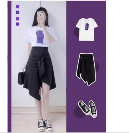 这条裙子其实可以搭配很多种风格的上衣,这样的搭配就显得没有那么严肃了,但还是比较有气质的。白色T恤给下身的这条裙子带入了不少的生活气息,不规则的裙摆,侧面的木耳边和抽带设计感满满,木耳边的皱褶程度可以通过抽带来改变,是优雅小女人的感觉哦。
