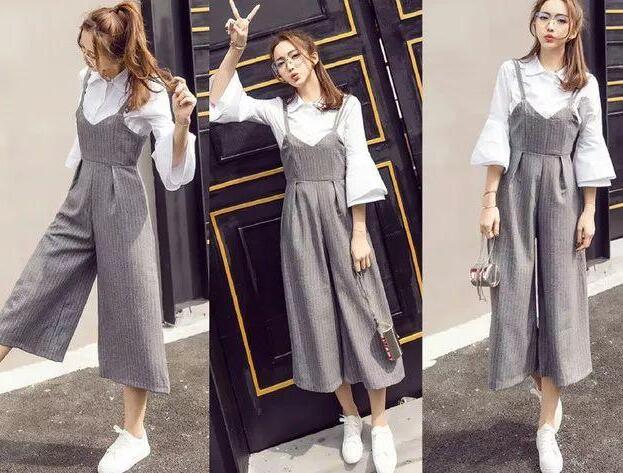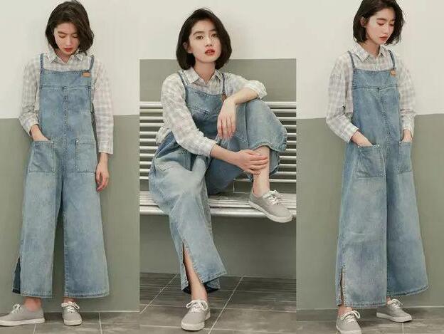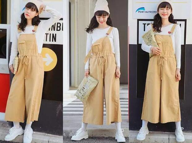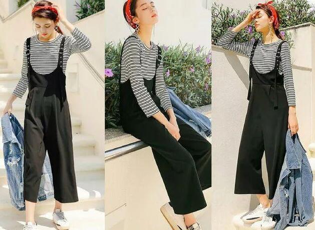 休闲风格的背带阔腿裤,很适合2019年春天穿的裤子款式,随意穿上就有显腿长的效果了,适合小个子妹子穿呢,内搭一件白色的衬衫,给到你小清新的气质,很美!背带阔腿裤搭配上衣图片