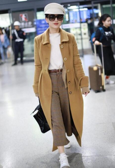 温柔的驼色的大衣,非常衬小仙女的肤色。选择白色单品再不过了,提亮效果特别好。白色的帽子、内搭单品、鞋子的白色遥相呼应,尽显时尚高格调,特别有整体感。小仙女下装pick格纹裤子,给纯色look加入经典元素,使整体有了重点。
