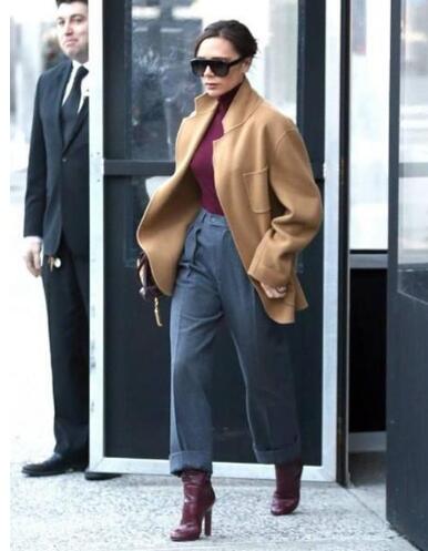 喜欢沉稳一点的小仙女可以用暗红色内搭单品来hold住驼色大衣,下身get灰色的裤子,尽显时尚高格调。把单品的下摆塞进裤子里的穿法,可以展现小仙女的完美的腿长比例哦。这时候pick暗红色的靴子,这样搭配,可以提升小仙女的整个气场,妥妥的御姐范。