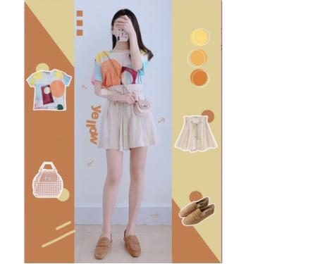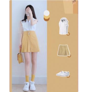 白色的连帽背心除了搭配T恤之外还可以单穿,也是非常精致的,搭配带有土棕色调的黄色小半裙,顿时又乖又有气质,约会通勤完全OK。黄色半裙的看上去虽然比较简约,但其实还是比较有设计感的,一半的线条感让整体看上去简单而不单调,脚上面的搭配最好就是选择白色鞋子和呼应鲜艳色彩的黄色袜子了。