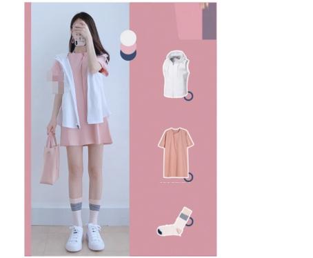 这一身搭配看上去就比较的有学生气息了,很干净,穿上身也是超级减龄的,粉色的长款T恤干净简约,但是当裙子一件单穿就会显得有一些单调了,所以在外面搭配上一件白色的连帽背心,马上就有了不一样的层次感,穿上小白鞋和同色系的中筒袜,上下呼应,少女感满满。很适合学生党们哦。