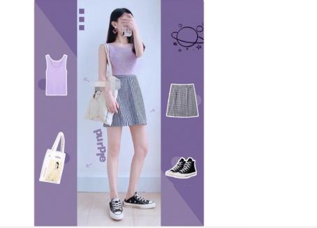 谁说裙装不能算是运动风?喜欢穿裙子的女孩一样也可以走运动的路线,淡紫色的针织背心非常有弹性,合身显瘦又有型,搭配黑白格纹A字裙和简约的帆布鞋,简单又时尚,十足的可盐可甜街头少女风范。