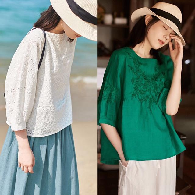 日常的穿搭中我们还可以选择亚麻针织的上衣,最大的特点在于亚麻的面料透气感强,穿上后面料会呼吸,衣服上的小洞口透气性非常好。