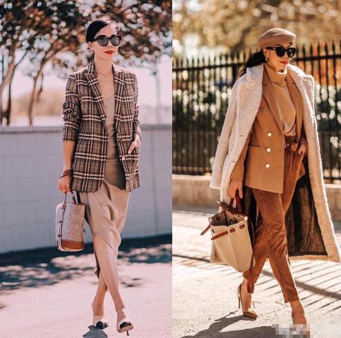 高级感的穿搭里,自然是少不了同色系的穿搭,驼色的阔腿长裤搭配驼色皮草大衣,内搭相近色系的V领小背心,高贵大气,满眼尽是高级感。