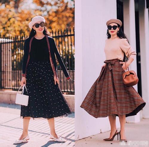 当然,有时候简简单单的单品、配色也能穿出时髦与气质,比如黑色毛衣搭配波点纱裙,搭配贝雷帽,浅驼色毛衣搭配格纹A字半长裙,都是简单的单品,却十分优雅、时髦、高级。简单高级又有气质的冬天搭配