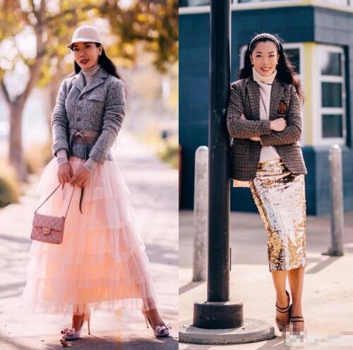 今年流行的蛋糕裙,别看透着可爱风格,但是搭配一件灰色羊绒短款外套,用腰封勾勒,搭配礼帽,个性又时髦,墨羽最喜欢的还是这个金光闪闪的包臀半裙搭配灰色小西装,内搭高领毛衣,复古风情,很有八九年代女明星的感觉。