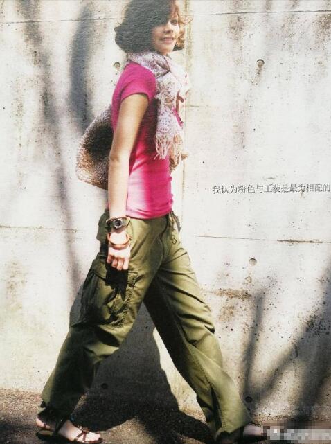 看看这件玫红和军绿色带有酷酷口袋的工装裤搭配,模特就这样柔柔媚媚地英姿飒爽着,是不是有种耳目一新的新鲜chic感!迷死人啦!▼