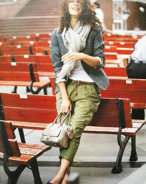 白色体恤+军绿色合体工装裤,看似平淡无味的装束,用酷酷的墨镜,柔软的围巾妆点,点睛的纹理腰带,还有随意挽起的裤脚,用这种细节搭配来打造丰富酷毙的整体造型。