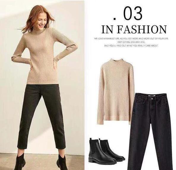 浅驼色的竖纹理针织高领,穿衣技巧!作为内搭是非常好搭配的,不过一件衣服最高的价值就是既可以做内搭,也可以外穿,这件上衣就是也可以外穿的,搭配一个直筒的黑色牛仔裤和小皮靴,就非常的修身显身材。