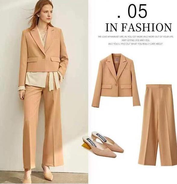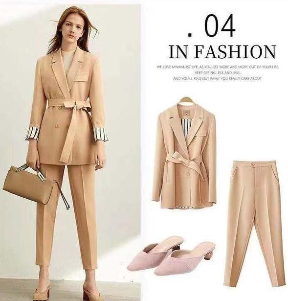 现在很多的西装都是设计成一整套的上衣和裤子,或者是裙子的颜色都是一样的。这样的服装看起来非常和谐,再加上西装垂坠的面料,整套服装就会让人感觉特别的干净舒服。这套驼色的西装就是在上衣的收腰处,有特别的处理,是利用蝴蝶结绑带的方式来固定,让腰身变得更纤细。西装的袖口也有一定的设计,利用折起来的方式来体现内里的竖条纹。
