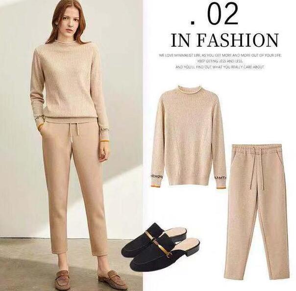 浅驼色是今年非常流行的色系,浅驼色给人的感觉就是非常舒适,浅驼色的搭配也可以上身下身都利用起来,颜色只需要有一个比较不明显的递进就可以了。可以选择裤子稍微深一点,或者是上衣稍微深一点,这样的一套服装会让人感觉干净利落,毛衣没有太多花哨的图案,袖口有一点图案点缀。如果怕显得太普通,可以换一双黑色的鞋子来搭配。