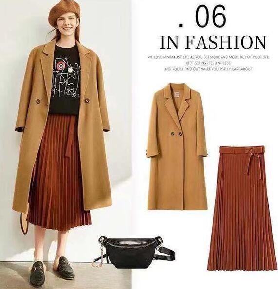 饱和度比较高的驼色,大衣的颜色是最为适合,毛呢外套是具有气场的,尤其是廓形比较大的长款外套。这款长款外套就是用了饱和度高的深驼色来搭配,里面的搭配有图案的黑卫衣和百褶棕红色针织裙,一整套非常的具有知性美。帽子和腰包这些时尚的小物也让穿搭变得更有活力。