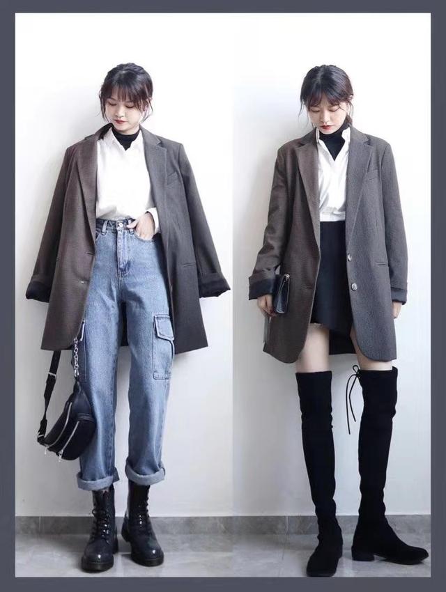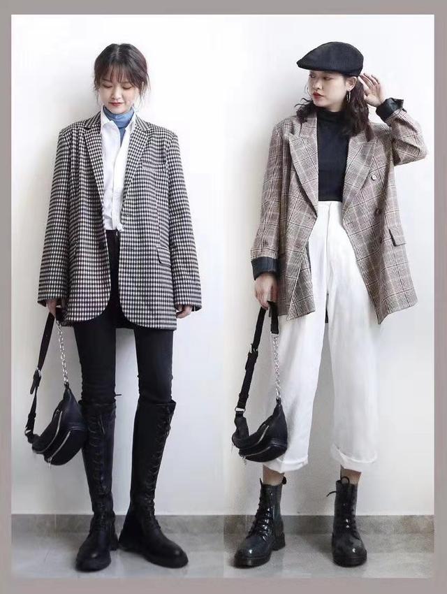 马丁靴搭西装外套和牛仔裤,自然知性,是非常好看也非常年轻的职业装。因为西装外套和衬衣的搭配本身非常职业,但是马丁靴的搭配却使得整体的搭配不会显得像工作那样刻板、严肃,增加了一点俏皮感。高筒靴比较适合短裙和西装外套,首先最吸引人们的地方一定是长腿优势,其次长筒靴也使得整体性感、外向。