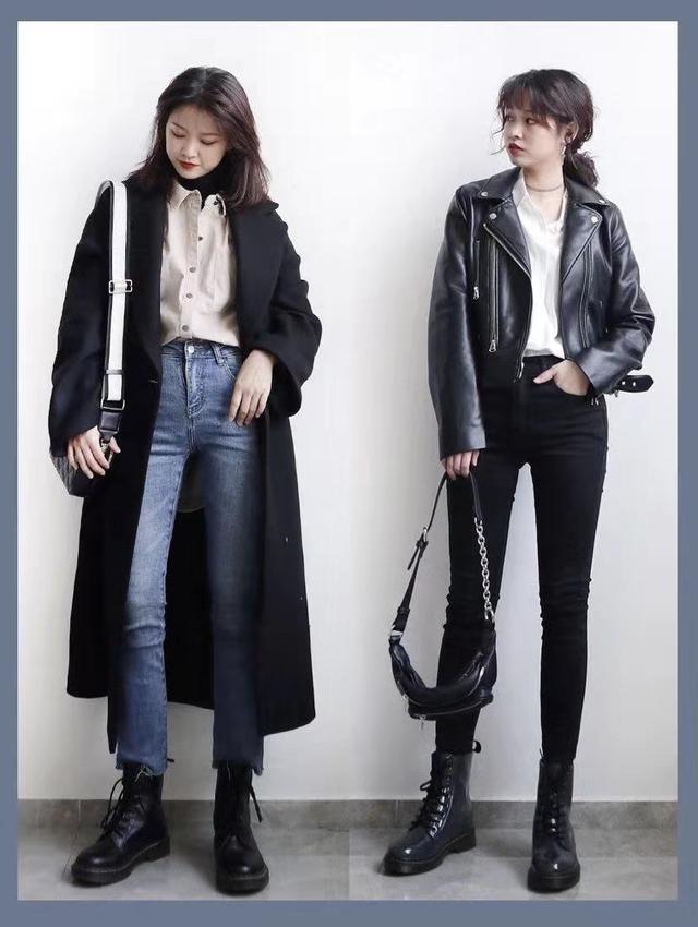 高筒靴和马丁靴在本质上是一致的,它们都可以帮助个人塑造独特的风格。一件黑色的大衣内搭衬衣,搭配屋,知性美丽、优雅温柔,再搭配一条九分修身牛仔裤,气场全开,足以让人拍手叫好。而搭配高筒靴或者是马丁靴,油然的添加了几分自然的酷炫之美。除了大衣,我们也可以选择一件帅气的皮衣,能够形成一致的酷炫美。