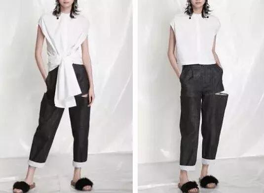 像这样比较另类的服装搭配,没有尝试过的妹子真的要尝试下,展现女性的活力气息,尤其这件“不一样”的上衣,由两部分组成的无袖款式上衣,纽扣拼接而成,拼接的部分可系上大大的蝴蝶结,甜美而帅气,也可以松开纽扣,又是另外一种造型,搭配萝卜的破洞个性牛仔裤,这个夏天总能穿出属于自己的一番独特味道!