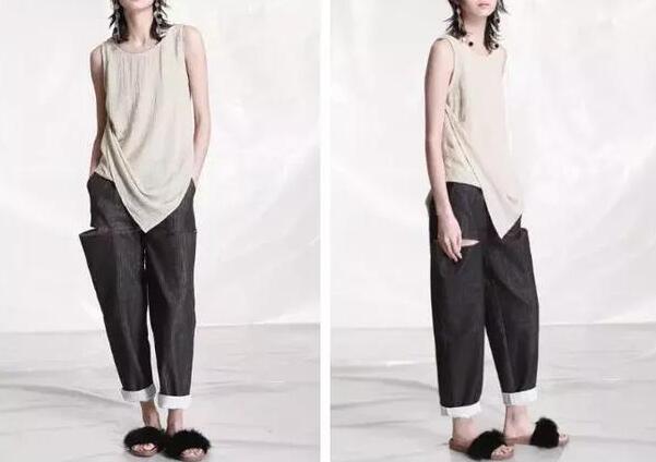 精致的女人偶尔穿随性一点也很有魅力,夏季来一件透凉的背心很舒服,不规则的下摆个性感十足,简单的纯色系设计,带着一丝复古感,下装是一款萝卜版型的牛仔裤,它不简单不普通,细看大腿位置的“分割”设计,让人挪不开视线,搭配一双拖鞋,慵懒随性的感觉真好~