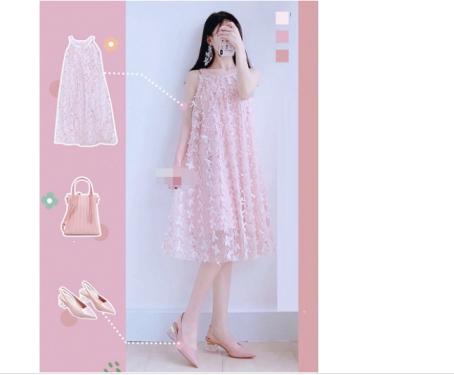 简直就是一条无敌浪漫的花仙子连衣裙呀,裙子是有两层的,里面是嫩粉色的绸缎材质,冰冰凉凉的也很亲肤。外层是比较有立体感的淡粉色薄纱,纱的质地是稍稍有点硬的,所以可以把整条裙子蓬蓬的版型撑起来。立体的小花朵装饰灵动俏皮,挂脖的款式简洁大方,能够凸显出美丽的肩颈线条,满满的少女心呀~