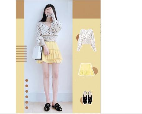 V领和束腰束袖口的设计超级的显瘦,而且也很百搭,大V领的设计超级能凸显锁骨,波点真的是经典又永远不会过时的一个时刻元素。搭配上一条设计感满满的嫩黄色小短裙,活泼可爱又明媚,裙子的不规则双层设计很有层次感,百褶的下摆也会显得腿瘦哦。